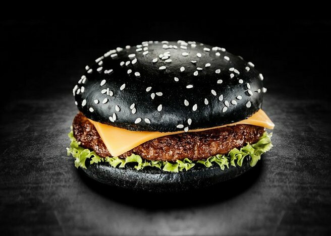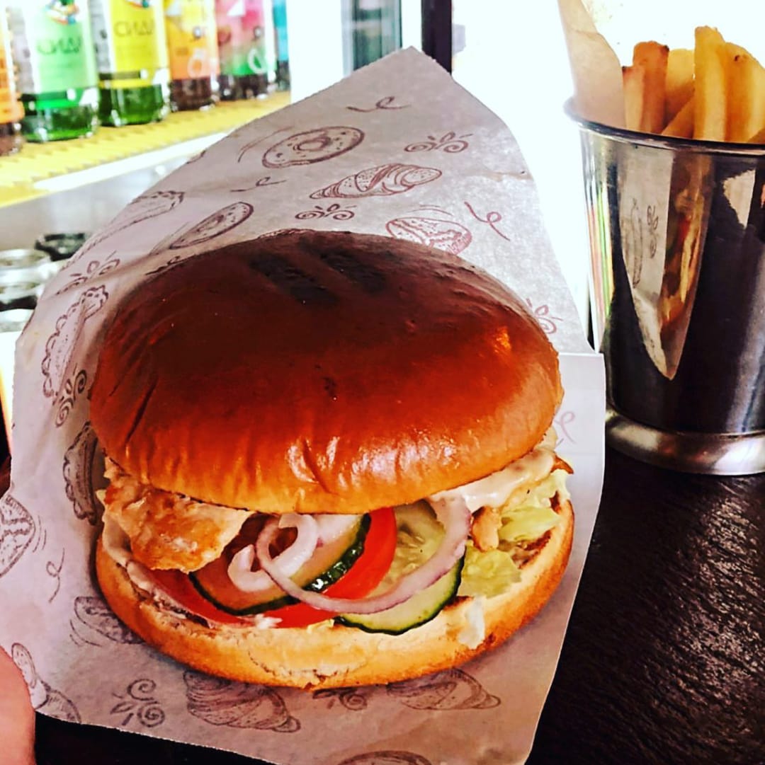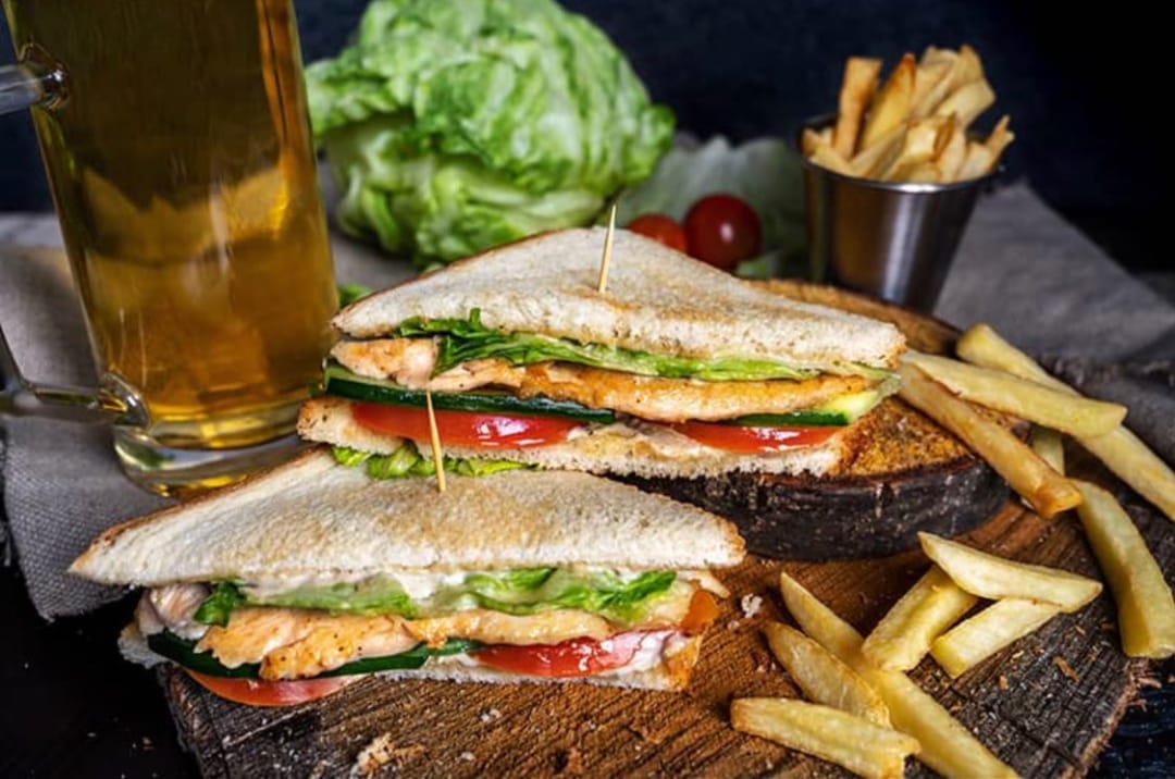 Хрустящий хлеб, куриная грудка, свежие овощи. Подается с картофелем фри.