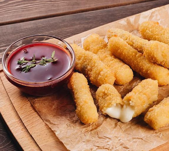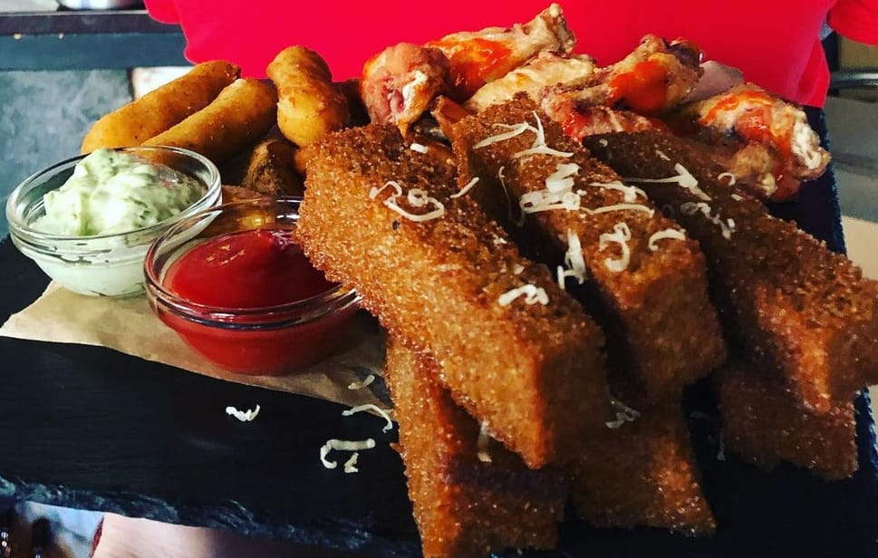 Крылышки "Баффало", чесночные гренки, картофель по-деревенски, сырные палочки, кетчуп, чесночный соус